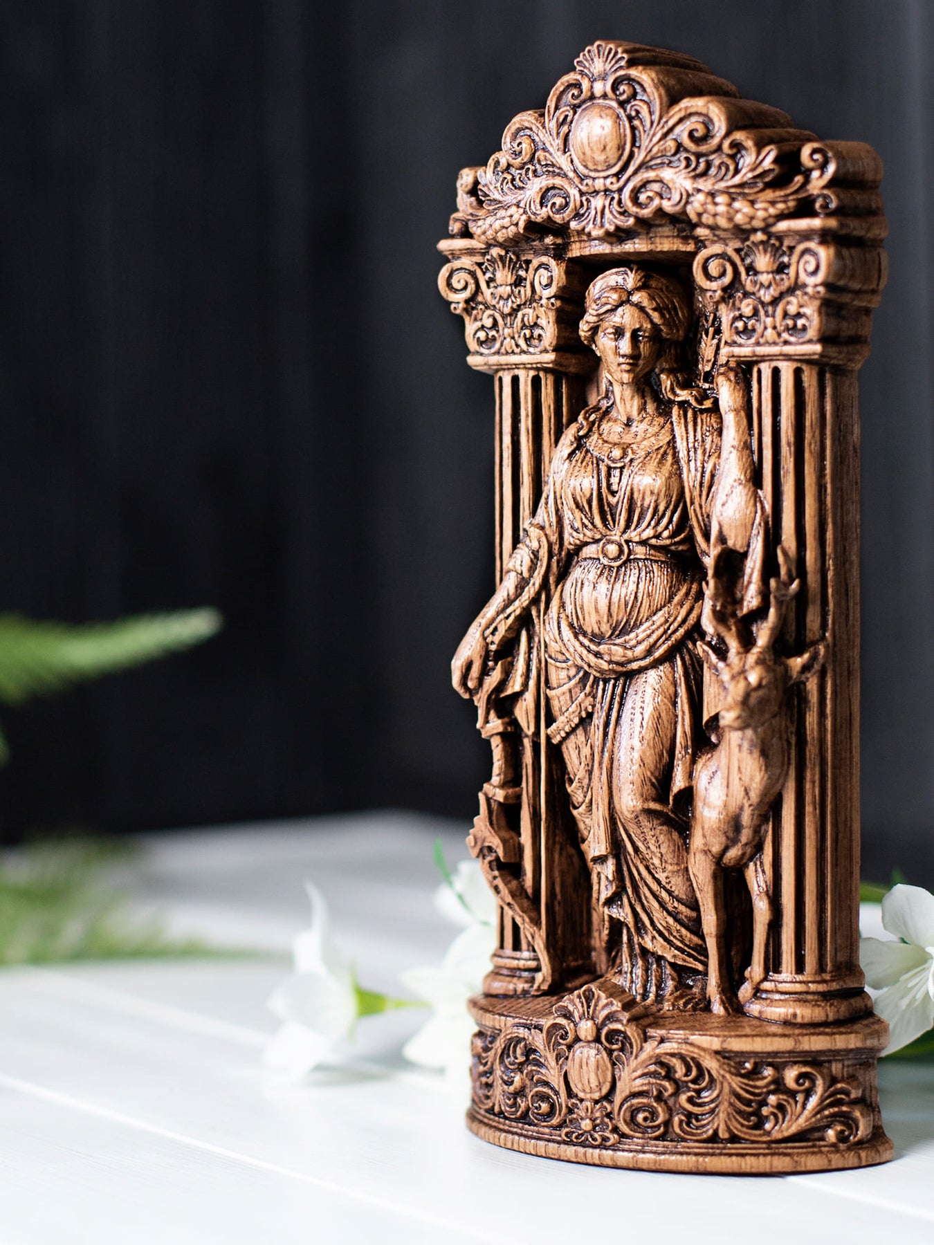 This handcrafted wooden figurine portrays Artemis, the revered greek goddess of the hunt, wild nature, and protector of animals. Identified also as goddess diana in Roman tradition, Artemis stands as one of the most powerful and independent deities of greek mythology. This artwork merges the symbolism of both artemis statue and diana statue traditions, making it an exceptional devotional piece for any artemis altar, mythological collection, or admirer of divine feminine strength.