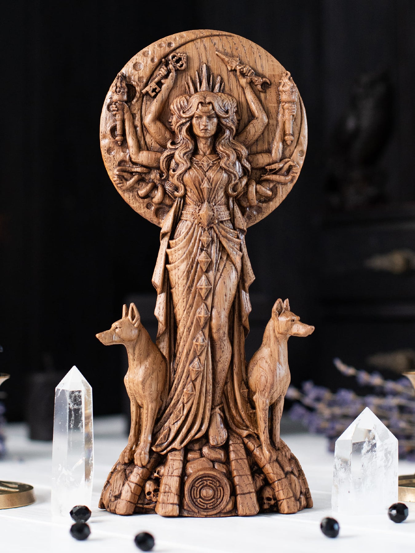 This handcrafted wooden figurine depicts Hecate, also known as Hekate, the enigmatic guardian of thresholds, night mysteries, and transformative power. Revered across ancient myth and modern practice, hecate statue and hekate statue representations honor her influence over shadow, intuition, witchcraft, and the liminal spaces where worlds meet. As hecate of the roads, she governs every crossroads—physical, spiritual, and psychological—making this artwork deeply meaningful for practitioners of shadow work, deity identification, planetary magick, and lunar magick traditions.