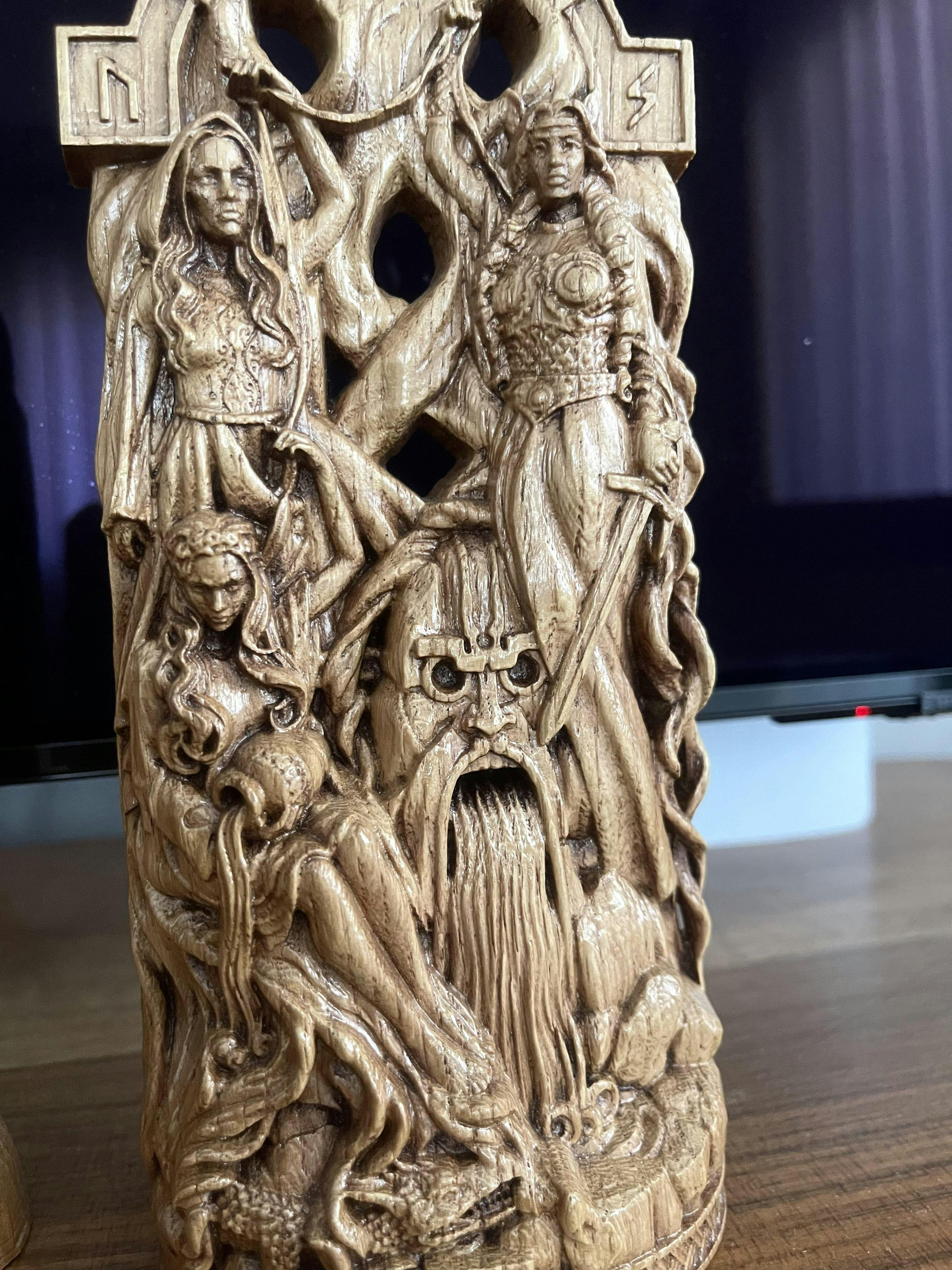 They dwell at the source of Urd, the sacred wellspring at the very roots of the Yggdrasil Tree, profoundly symbolizing their intimate connection to the cosmic order and the flow of time. Daily, they meticulously irrigate the roots of Yggdrasil with water from this sacred spring, bestowing eternal life and vitality upon the World Tree. The Norns jealously guard this source, which holds the key to the knowledge of runes, gods, and the universe, making it a wellspring of ultimate wisdom. According to legend, even Odin, the All-Father, once approached the Norns to sip wisdom from this source of Fate, highlighting their supreme authority. This wooden statue beautifully captures the mystical essence and profound significance of the Norns, embodying their role as keepers of destiny and cosmic knowledge, making it a captivating addition to your home or sacred altar.