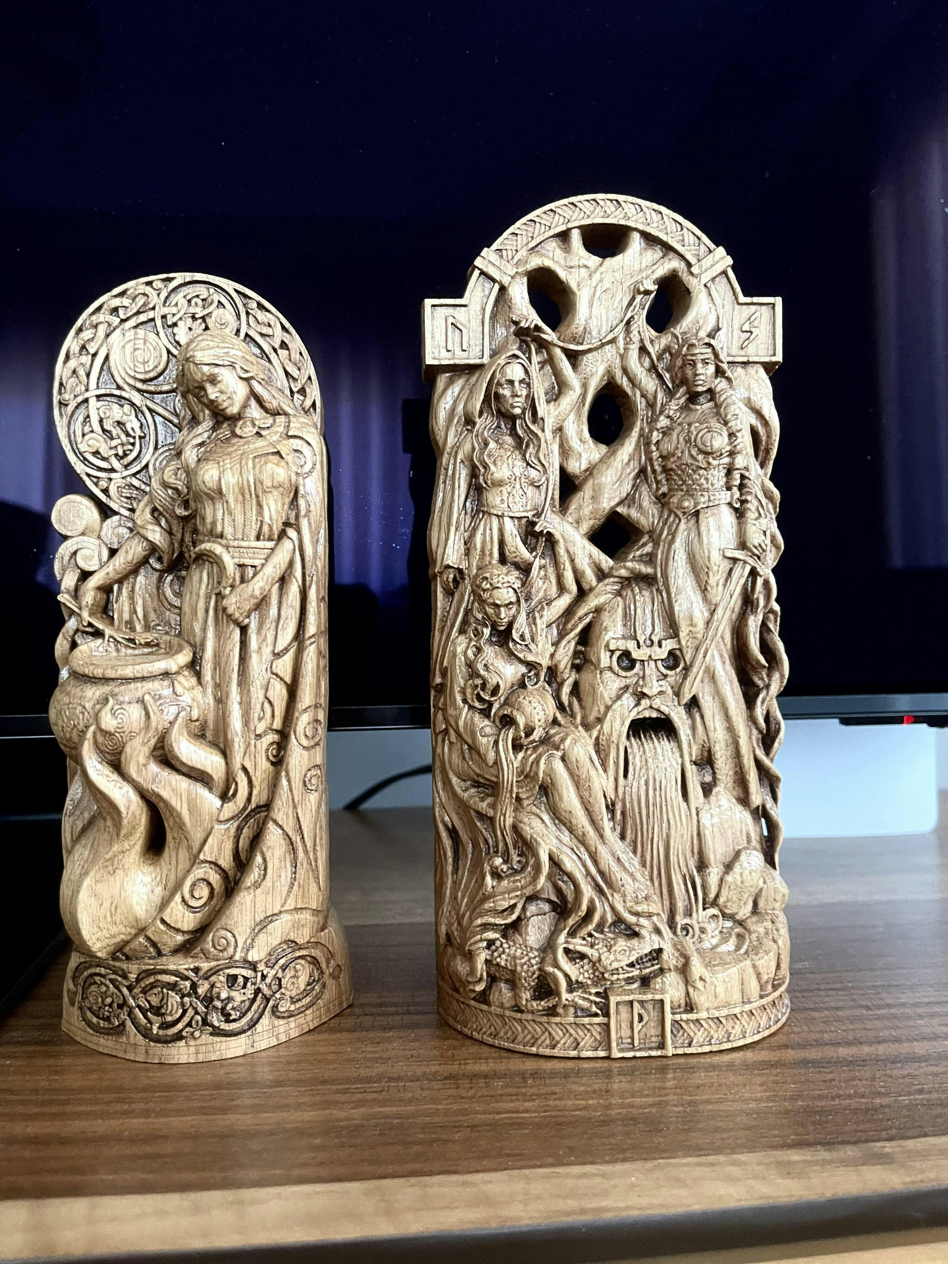 This handcrafted wooden statue powerfully depicts the Three Norns—Urd, Verdandi, and Skuld—the formidable Norse goddesses who weave the fate of every man and god. As cosmic weavers, they embody the profound interconnectedness of past, present, and future, holding the threads of destiny for all beings in the Norse cosmos.