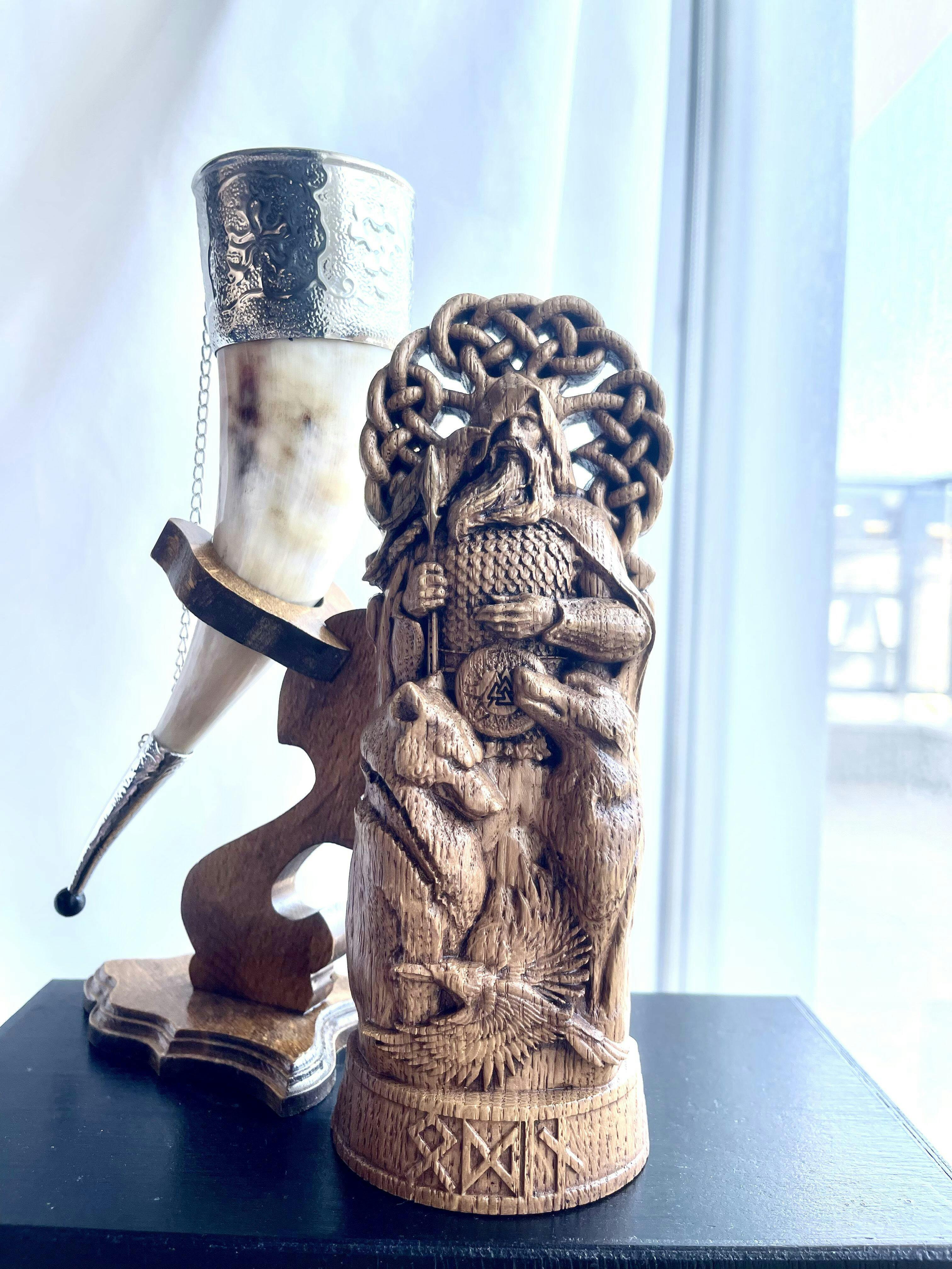 This handcrafted wooden figurine magnificently captures Odin, the paramount deity in Norse mythology, revered as the All-Father. He is the chief of the Æsir gods, associated with wisdom, war, poetry, magic, and death. Odin is known for his relentless pursuit of knowledge, having sacrificed an eye for wisdom and endured suffering to gain the runes. This meticulously carved wooden piece embodies his profound authority and multifaceted nature, making it a truly captivating addition to a personal collection, a commanding decorative accent for a home, or a powerful focal point on an altar.