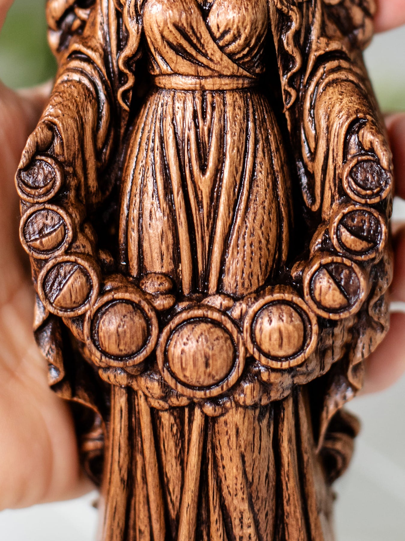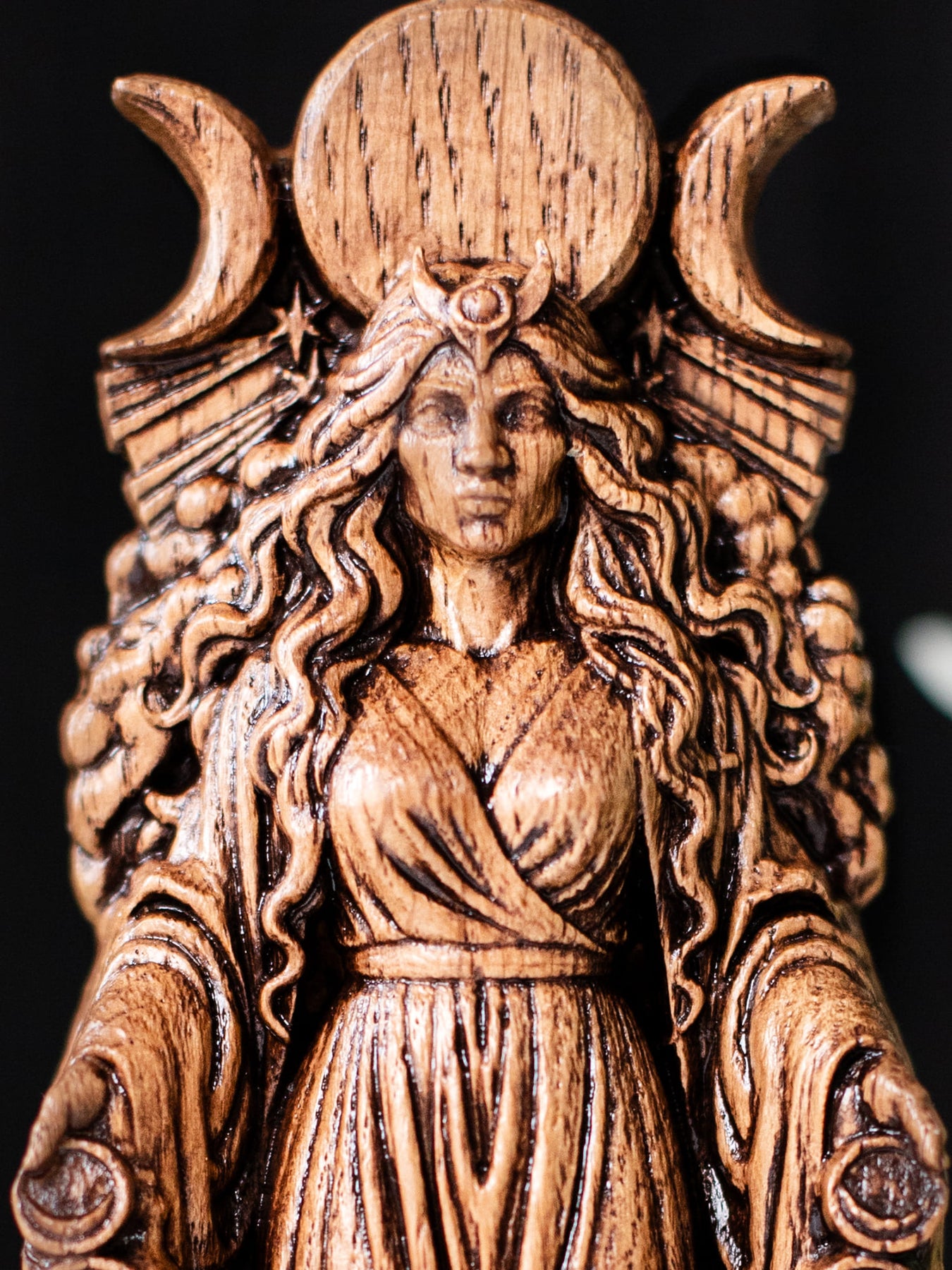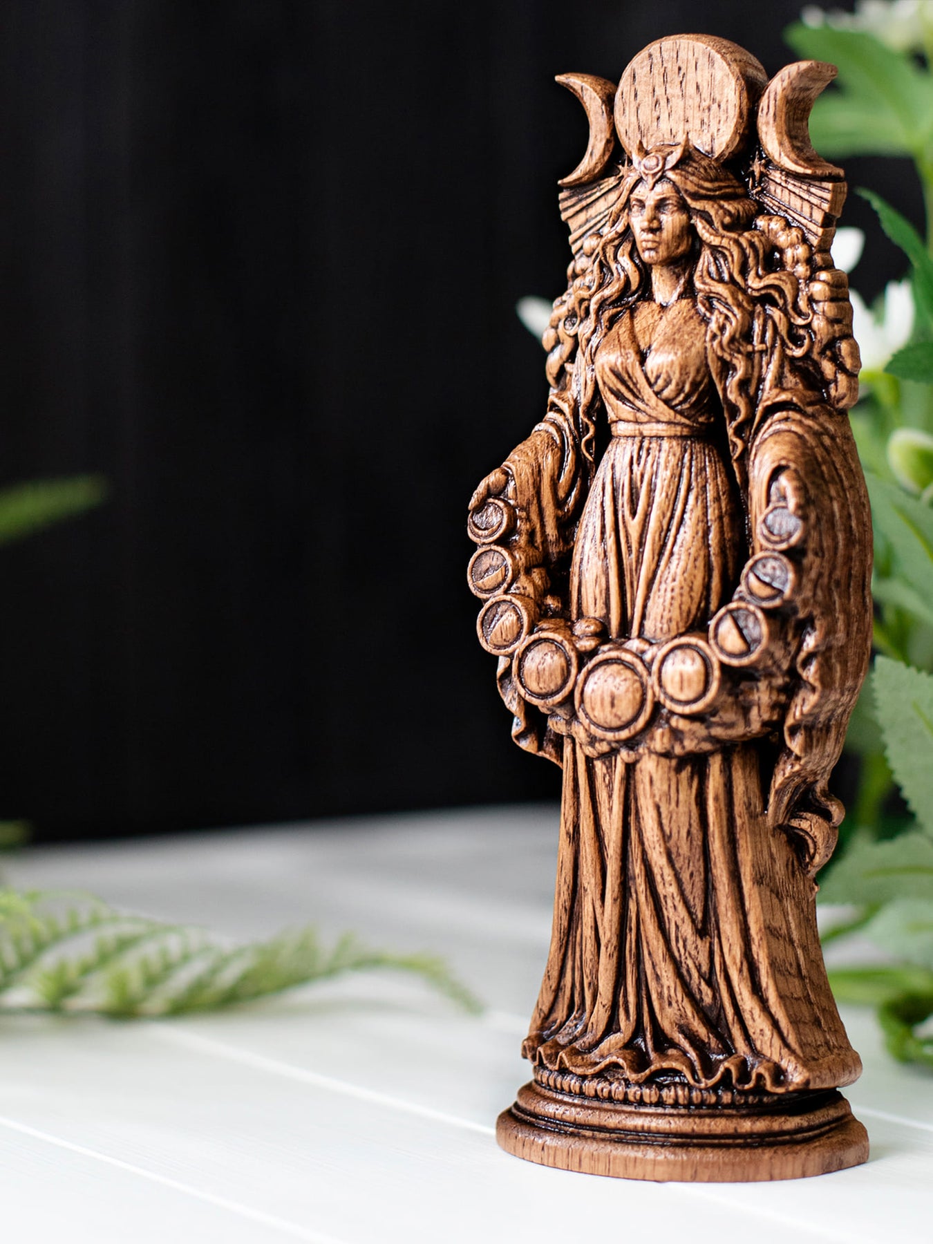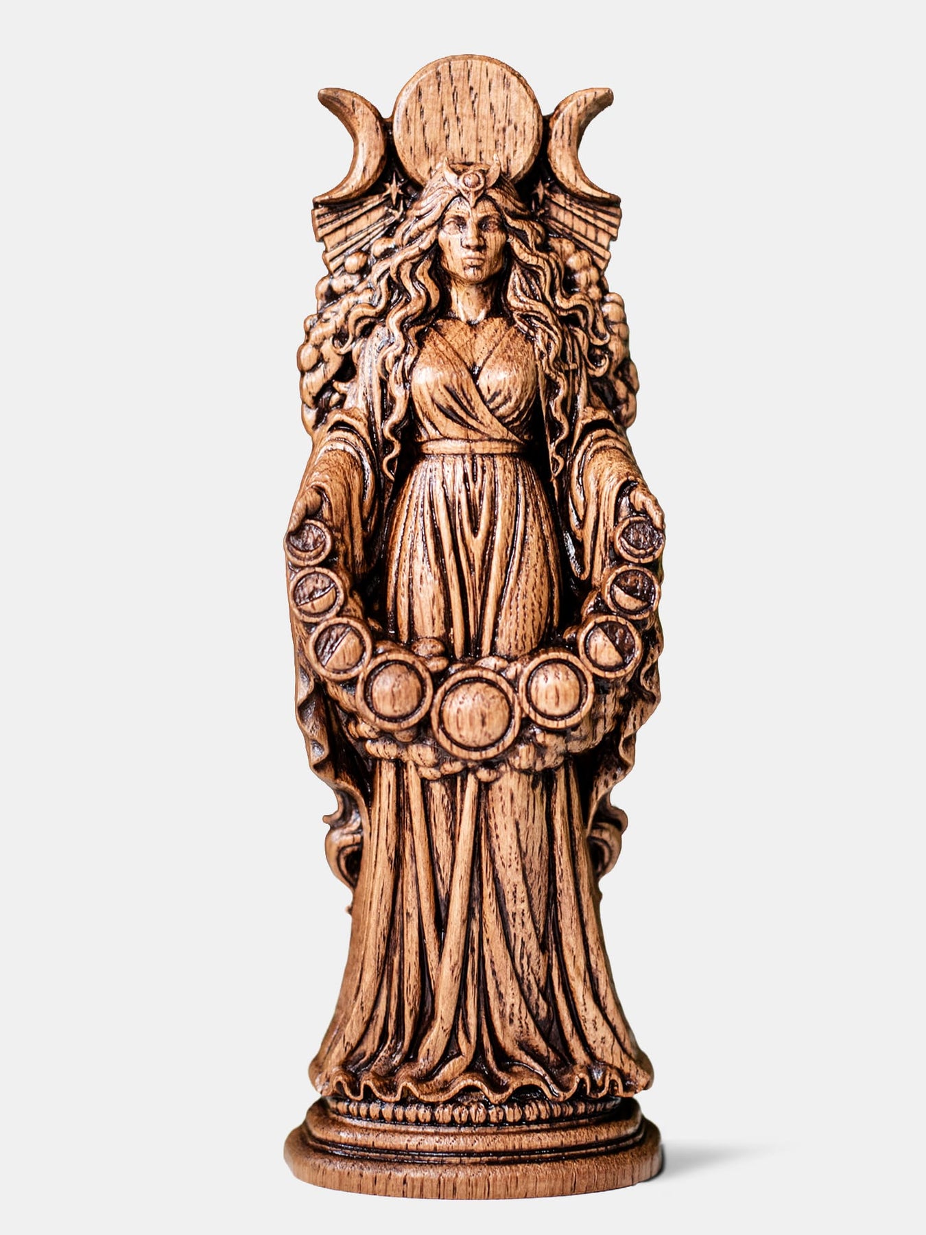 This handcrafted wooden figurine portrays Selene, the revered Selene moon goddess of Greek mythology, celebrated as the eternal embodiment of the lunar light that guides the world through darkness. Known for her grace, serenity, and celestial purity, Selene governs lunar cycles, night magic, and the gentle power of illumination. This makes the statue a meaningful centerpiece for any selene altar, as well as a refined addition for collectors seeking an authentic Greek goddess statue or spiritual wooden goddess figure.